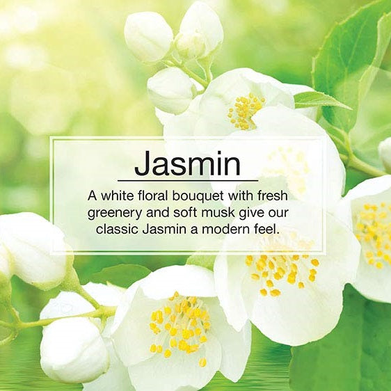 Jasmin: A white floral bouquet with fresh greenery and soft musk give our classic Jasmin a modern feel.